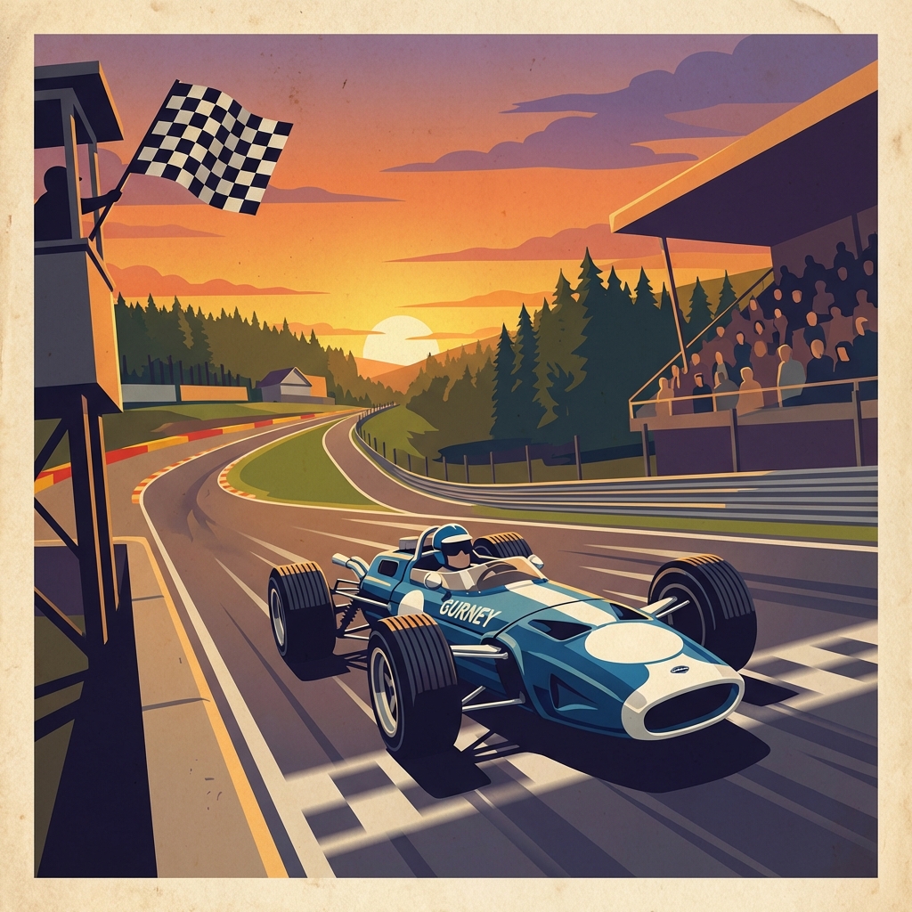 The final lap. The Eagle surges through Eau Rouge, that legendary uphill left-right combination that separates the brave from the merely fast. Gurney's hands are steady on the wheel, his focus absolute. Behind him, Jackie Stewart's BRM is more than a minute adrift. The race has been won—but Gurney pushes on, wringing every last ounce of speed from his creation.